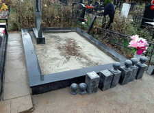 Завершающим этапом стала сборка оградки и укладка брусчатки. Ограждение мы создали из находившихся на могиле секций, кое где закрепив отломавшиеся навершия на разделительные столбики. Перед памятником мы установили гранитный цветник и две траурные урны, а по правую сторону от входа поставили заказанную клиентом лавочку, тоже изготовленную из чёрного гранита. Брусчатку мы замыли водой, одновременно удаляя всю строительную пыль, образовавшуюся в процессе работы.